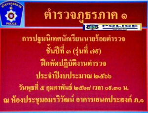 เมื่อวันที่ 5 ก.พ.2568 เวลา 09.30 น. พ.ต.อ.ภัคพงศ์ สายอุบล รรท.ผบก.อก.ภ.1 ในฐานะผู้รับผิดชอบ ฝอ.5 บก.อก.ภ.1(งานประชาสัมพันธ์ข่าวและแถลงข่าว) เปิดเผยว่า ทางผู้บังคับบัญชาโดย พล.ต.ท.สุรพล เปรมบุตร ผบช.ภ.1 ได้มอบหมายให้ พล.ต.ต.ศิลปคมณ์ เอี่ยมวงศ์ รอง ผบช.ภ.1 ประธานพิธีการปฐมนิเทศนักเรียนนายร้อยตำรวจ ชั้นปีที่ 3 (รุ่นที่ 79) ประจำปีการศึกษา 2567 เข้ารับการฝึกหัดปฏิบัติงานตำรวจ