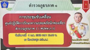 เมื่อวันที่ 4 ก.พ.2568 เวลา 13.00 น. พล.ต.ต.โชคชัย งามวงศ์ รอง ผบช.ภ.1 ประธานการประชุมขับเคลื่อนศูนย์ปฏิบัติการรักษาความปลอดภัยนักท่องเที่ยว ตำรวจภูธรภาค 1 (ศปทท.ภ.1)