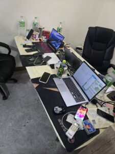 คอมพิวเตอร์โน๊ตบุ๊คจำนวน 3 เครื่องและโทรศัพท์มือถือจำนวน 29 เครื่อง วางอยู่บนโต๊ะที่คนจีนทั้ง 5 คนกำลังนั่งทำงานอยู่ จากการสอบถามคนจีนทั้ง 5 คน รับว่าได้มาเช่าบ้านหลังดังกล่าวทำงานเป็นแอดมินรับแลกเงินให้ลูกค้าเว็บไซต์พนันออนไลน์ซึ่งมีลูกค้าเป็นคนจีนโดยได้ค่าจ้างคนละประมาณ 40,000 บาทต่อเดือน