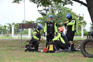 พร้อมทบทวนข้อมูลและเรียนรู้เกี่ยวกับการตรวจสอบโครงสร้างต่างๆ การพิจารณาสาเหตุรอยร้าว การตรวจสอบอาคารวิบัติ การเข้าแก้ไขเบื้องต้น ฯลฯ โดยแบ่งกลุ่มฝึกปฏิบัติเรียนรู้วิธีลดการพังทลายของโครงสร้างอาคาร การกำหนดสัญลักษณ์การค้นหา ฯลฯ รวมถึงเรียนรู้เกี่ยวกับภารกิจของสุนัขกู้ภัย (K9)