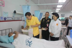 พร้อมด้วยคณะแพทย์ พยาบาล และบุคลากรทางการแพทย์ ให้การต้อนรับและรายงานความคืบหน้าการดูแลรักษาผู้ได้รับบาดเจ็บ รวมถึงการเตรียมความพร้อมด้านการรักษาพยาบาลรองรับสถานการณ์ฉุกเฉินในพื้นที่ชายแดน