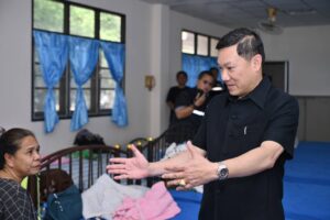 นายอำเภอ และภาคีเครือข่าย ร่วมกันบริหารจัดการศูนย์พักพิงชั่วคราวให้กับประชาชนในการลงพื้นที่ในช่วงบ่ายนี้ ปลัดกระทรวงมหาดไทย ได้พูดคุยเสริมสร้างขวัญกำลังใจและรอยยิ้มกับประชาชนภายในศูนย์พักพิงพร้อมทั้งทักทายหยอกล้อประชาชนที่กำลังรับชมกีฬาซีเกมส์ และได้ไปเยี่ยมเยียนประชาชนจิตอาสาที่ปฏิบัติงานโรงครัว และบริเวณที่พักอาศัย