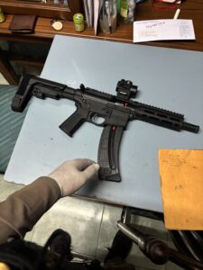 พร้อมด้วยของกลาง 1.อาวุธปืนยาว ชนิด เดี่ยวลูกรด ขนาด.22 ยี่ห้อ สมิทแอนด์เวทสัน หมายเลขทะเบียน สท04/6450045 จำนวน 1 กระบอก